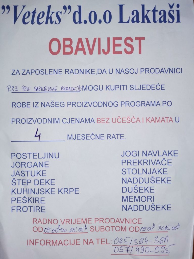 Obavještavamo vas da je Sindikat državne agencije za istrage i zaštitu zaključio Ugovor o kupovini na odgođeno plaćanje do 4 mjesečne rate sa preduzećem Vetex doo Laktaši koji iz svog asortimana našim članovima između ostalog nudi jastuke, jorgane, posteljinu, madrace, nadmadrace, peškire, stolnjaci i dr.